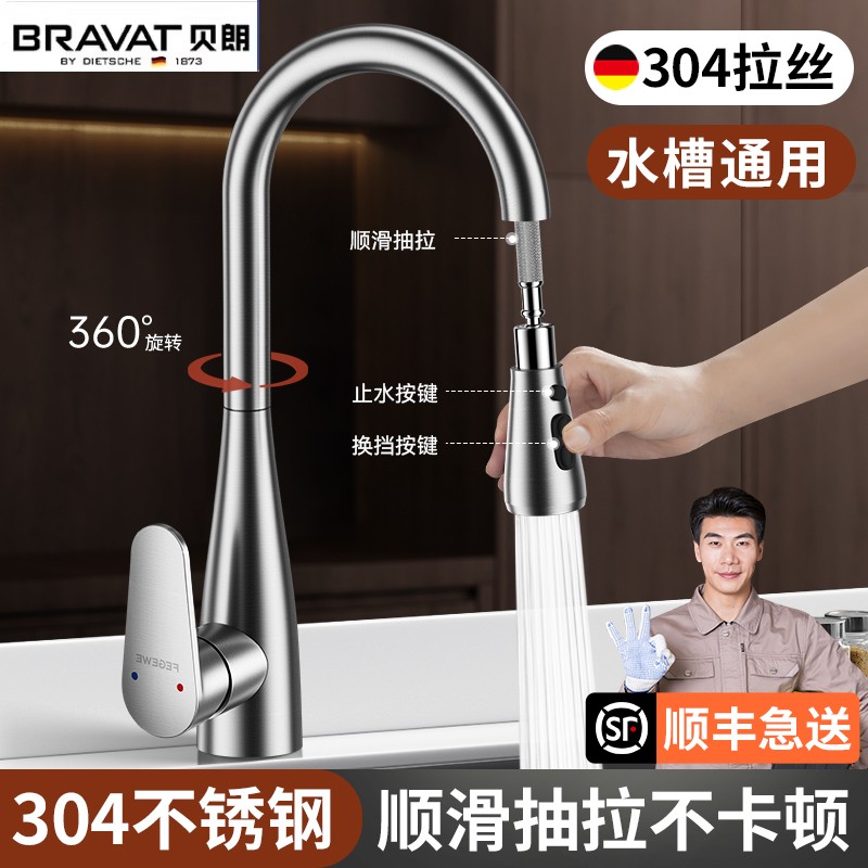 德国贝朗304不锈钢厨房洗菜盆抽拉式水龙头冷热两用水槽专用伸缩